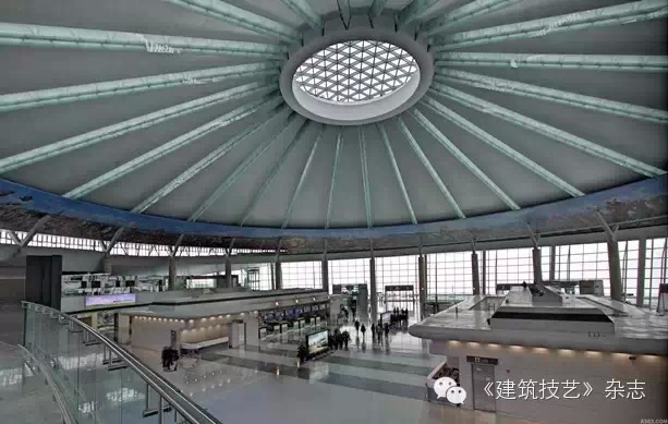上部大型鋼屋蓋采用混凝土鋼骨柱。航站樓直徑108m的穹頂采用24榀徑向桁架和桁架間的單層網架組成的錐形鋼屋蓋。中間30米直徑的鋼結構采用自我開發的軟件計算,達到“輕”“薄”“透”的要求。 大廳內的24根鋼骨柱支撐的的結構桁架最終演化為采光天窗的“光梁”;柱子與屋面的銜接處采用V型的鋼結構支撐,剛勁有力,有效地減小了結構跨度;幕墻的鋼拉索結構為室內提供了通透的效果,遮陽板同時成為了水平龍骨;穹頂中心的單層殼體結構與模數化的三角型采光天窗合二為一。
