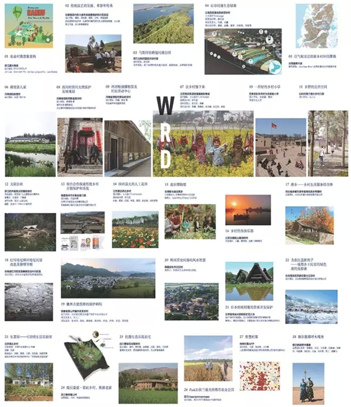 展覽精選了來自中國、美國、荷蘭、比利時、意大利、韓國、日本、臺灣等國家(地區)的相關八類機構遞交的三十個項目。第一類是由高校聯動的設計研究機構:如北京大學俞孔堅教授領銜的土人設計、清華大學羅德胤教授領銜的傳統村落研究團隊、清華大學藝術與科學研究中心劉新教授領銜的“可持續生活實驗室”、中央美術學院何崴教授領銜的團隊、香港中文大學吳恩融教授領銜的團隊、西安建筑科技大學穆鈞教授領銜的土上建筑工作室、中國美院陳浩如教授領銜的山上建筑設計事務所、比利時魯汶大學建筑學系相關研究團隊、韓國首爾大學環境學院相關研究團隊、住建部村鎮司現代生土建筑實驗室相關研究團隊等;第二類是國內傳統大型設計機構:如北京清華同衡規劃設計研究院有限公司、北京國文琰文化遺產保護中心有限公司、北京易肯建筑規劃設計設計有限公司等;第三類是以個人魅力為特色的鄉建先鋒:如綠十字的孫君、共享社區發展中心的牛健、智慧草原的李曉秋等;第四類是在鄉村設計上具有國際聲譽的境外設計機構:如美國SWA GROUP、比利時RLKM、荷蘭VISTA等;第五類是具有國際視野并且堅持本土創作的設計工作室:如比利時BUUR、臺灣劉國滄打開聯合文化創意有限公司、意大利B.OND等;第六類是具有產業創新思維的商業機構:如路野路亞、北京世紀唐人旅游發展有限公司等;第七類是相關專業媒體媒體:如景觀中國網站、《景觀設計學》雜志培訓考察交流中心等;第八類是熱衷鄉村事業的NGO:如AIM、中國扶貧基金會、無止橋慈善基金等。