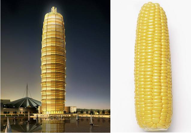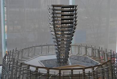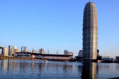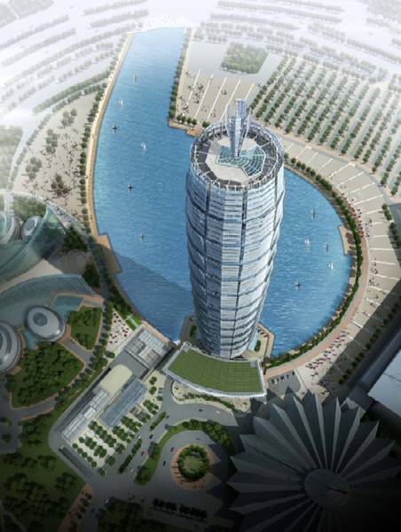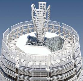 塔樓創意源自于中國古代寶塔嵩岳寺塔,建筑體型呈“紡錘”形。酒店區核心筒內樓板開洞,形成一個約88m深的共享天井,天井頂端天窗上矗立一高約30m的陽光反射器,陽光通過反射器的反射照入天井內,使得天井可以自然采光。