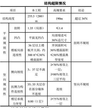 本主要超限情況如下表所示。結構在核心筒內38層以上設置約88.2m深的空中共享天井,見圖4。針對本工程的超限情況,采取了相應的抗震加強措施。