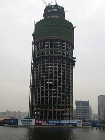 本建筑外框柱均為斜柱。外框柱從地上2層開始逐漸向外傾斜,在35層處平面直徑達到最大,然后轉折逐漸向內傾斜,一直延伸到屋面。柱在鉛垂平面呈二維多段折線,折線斜柱完美地勾勒出塔樓外形。同時辦公層內沒有柱子影響,大大提高了建筑空間的使用品質。