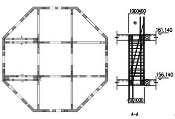 塔樓核心筒內采用現澆鋼筋混凝土樓板。樓面鋼梁與鋼筋混凝土筒體平面交接處設置預埋件,鋼梁與核心筒采用鉸接連接;核心筒八角部位徑向內外采用剛接,故在核心筒八個角部位設置型鋼。