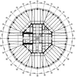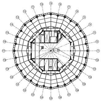 環向鋼梁與型鋼混凝土組合柱剛接,徑向八根與核心筒角部對應的鋼梁兩端與墻及框架柱均剛接,其余鋼梁與框架梁、柱、核心筒均鉸接。核心筒周邊剪力墻墻厚為900~400mm;型鋼混凝土外框架柱截面為從下往上φ1200mm~φ850mm,混凝土強度等級為C60~C40。結構用鋼量(鋼材)指標約103kg/m2。圖3,4為典型辦公層及酒店層結構平面布置示意圖。