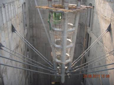圖7為本結構關鍵節點之一“箭尾”節點,反光器的8組高強鋼索均匯交于桁架下部“箭尾”節點,設計時采用柱狀加加勁肋節點。經ANSYS有限元分析表明節點處于彈性狀態。