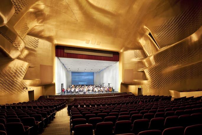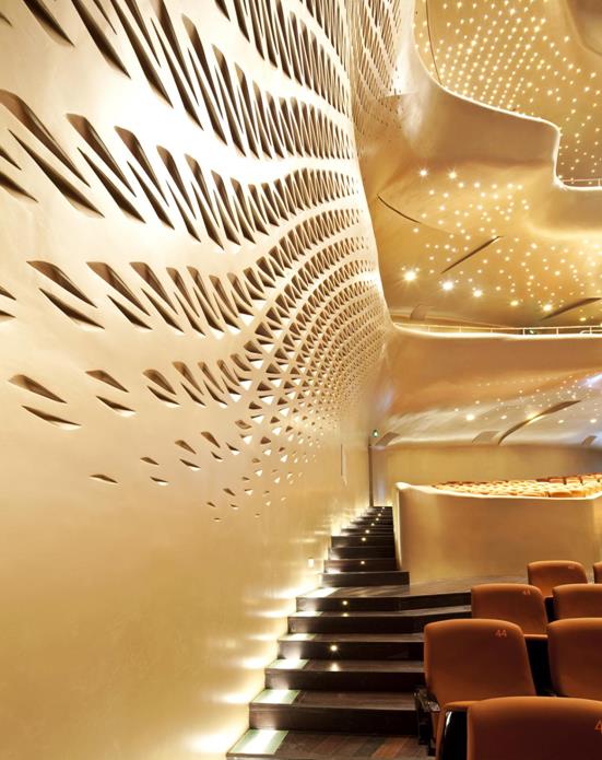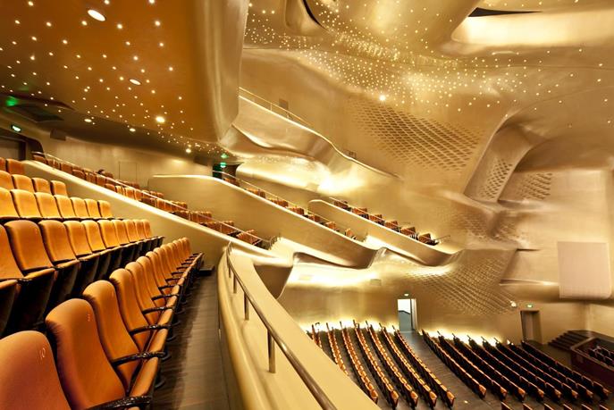 要滿足以上諸多方面的要求,同時又要延續扎哈的風格。中孚泰團隊在室內設計中充分理解了建筑的語匯,順勢而為,利用這些異形雙曲面形體構成良好的聲學構造,達成聲學之美的目的。同時用分解的觀念強調打碎、疊加、重組,重視形態、動感、節奏、韻律、獨特、情境、多元化表現室內空間的設計;以GRG材料的“融力”,以突出自然主題的力量、材料自身的美感和質感,又結合了形式感強烈的現代雕塑語言為結構支撐,彰顯強悍的氣質,結構嚴謹,充滿氣勢與張力,實現了其“雙手環抱形”看臺這種不規則室內體形以及“倒八字形”樂池等設想,有利于聲場的擴散和創造音質的空間感,保證了世界上僅有的兩個非對稱設計觀眾廳之一的優良音質效果。