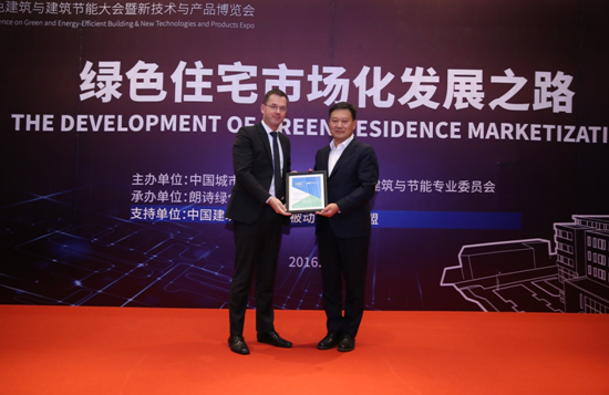 朗詩集團&朗綠科技董事長田明從世界銀行負責人塞爾吉奧·皮門塔手中接過朗詩布魯克被動房獲得的中國首個EDGE認證