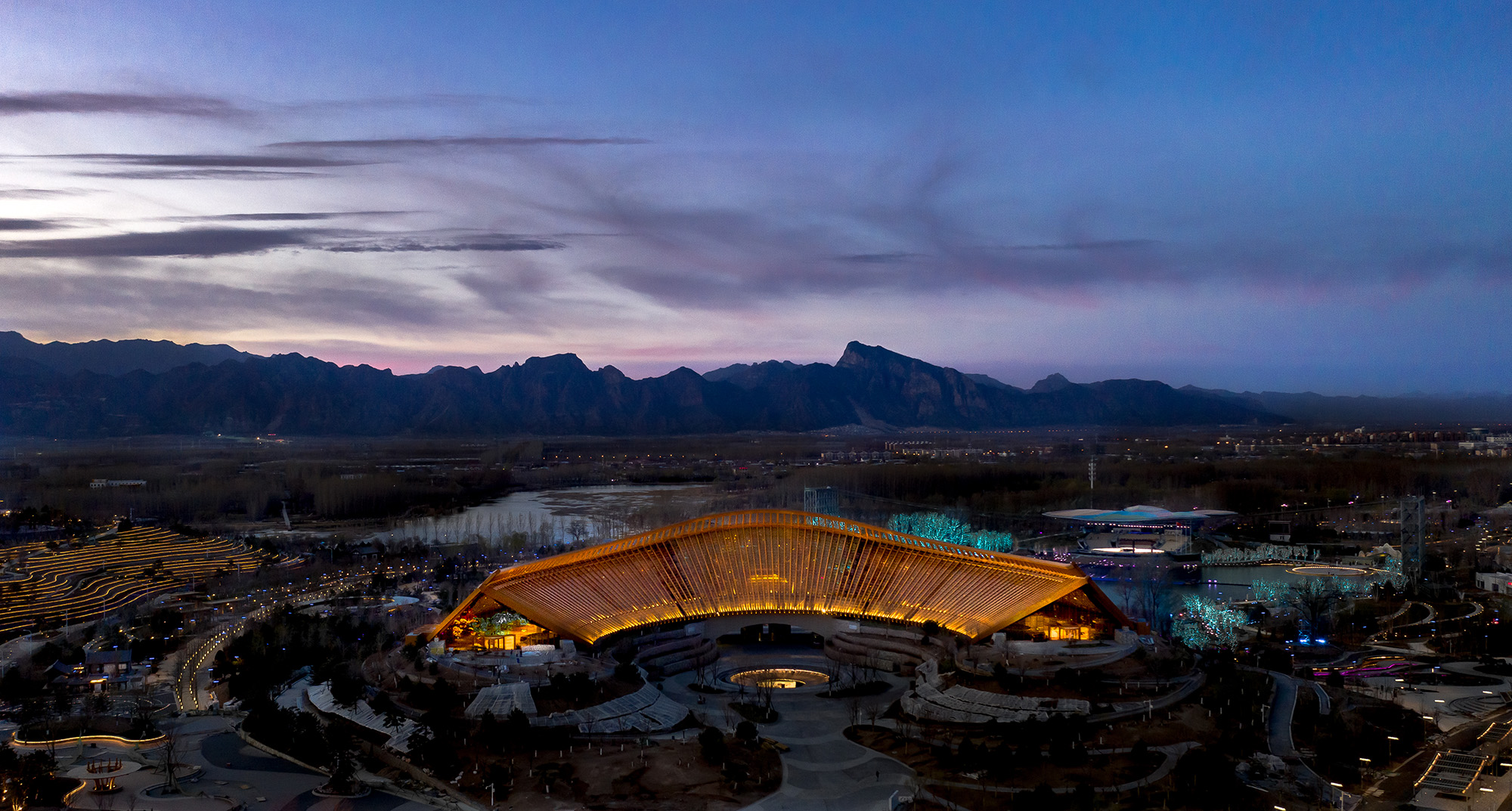 2019年北京世界園藝博覽會的標志性建筑——中國館,位于山水園藝軸中部,緊鄰中國展園,北側為媯汭湖及演藝中心,西側為山水園藝軸及植物館,東側為中國展園及國際館,南側為園區主入口。設計從農耕文化和中國傳統哲學出發,以層疊的梯田肌理為本底,將部分展廳置于地下,輕盈的鋼結構屋頂以龍脊抱月之勢勾勒出中國館圓滿溫潤的輪廓,既融入自然山水中,又成為園區的核心和焦點。