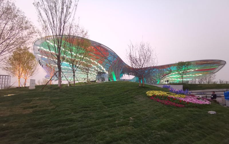 建筑宛如一只彩蝶駐足在媯湖之濱,更有“如云縈繞山間,如溪穿梭林間”的一色臺、華夏四方名花盛放的九州花境、翠影紅霞映朝日的千翠池、“花傘彩蔭濃聚,萬國佳客舉杯”的絲路花語;正可謂永寧高閣攬勝景、天田媯汭蝶飛舞,北京世園會園區將以其得天獨厚的自然景觀及獨具匠心的人工設計,使游客寄情山水園藝之中而流連忘返。它有一大兩小半室外劇場,將作為北京世園會開閉幕式的主會場迎接四海賓朋,并承擔會期各類大規模主題展演等大型集會活動。
