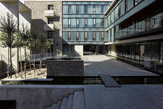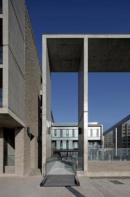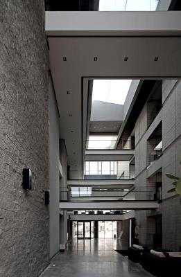 設計樓位于內蒙古工業大學新校區北側社區一角,用地40m×40m,地上4層,地下1層,建筑面積5967m² 。功能包括辦公、會議、圖檔、餐廳、健身房、停車等。設計的目標是在遮光、退線等城市規則決定基本體量的前提下,從形體空間到界面形式再到材質構造,營造屬于設計樓的空間品相。通過以下步驟實現:抽取角部體量留出邊院,并適度下沉,形成從城市空間到室內空間的過渡,增加入口空間的領域性;切分剩余體量,在其間留出中廳,引入陽光、組織通風,形成室內的公共核心空間,增強空間的識別度和場所感;選擇本色的材料和真實的構造統一了空間的基調,試圖讓整體傳達一種內斂、平靜、有歸屬感的場所性格。本項目由內蒙古工業大學建筑學院張鵬舉教授主持設計。