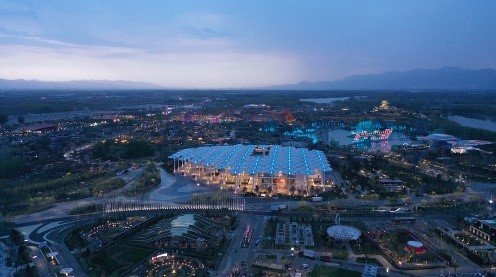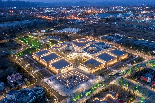 2019年北京世界園藝博覽會的標志性建筑——中國館,位于山水園藝軸中部,緊鄰中國展園,北側為媯汭湖及演藝中心,西側為山水園藝軸及植物館,東側為中國展園及國際館,南側為園區主入口。設計從農耕文化和中國傳統哲學出發,以層疊的梯田肌理為本底,將部分展廳置于地下,輕盈的鋼結構屋頂以龍脊抱月之勢勾勒出中國館圓滿溫潤的輪廓,既融入自然山水中,又成為園區的核心和焦點。