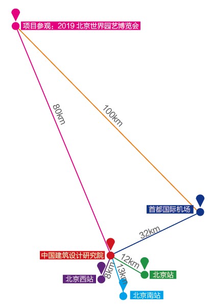 參觀項目距離中國建筑設計院約80km,距離北京火車站約88km,距離北京西站約90km,距離北京南站約100km,距離首都國際機場約100km。