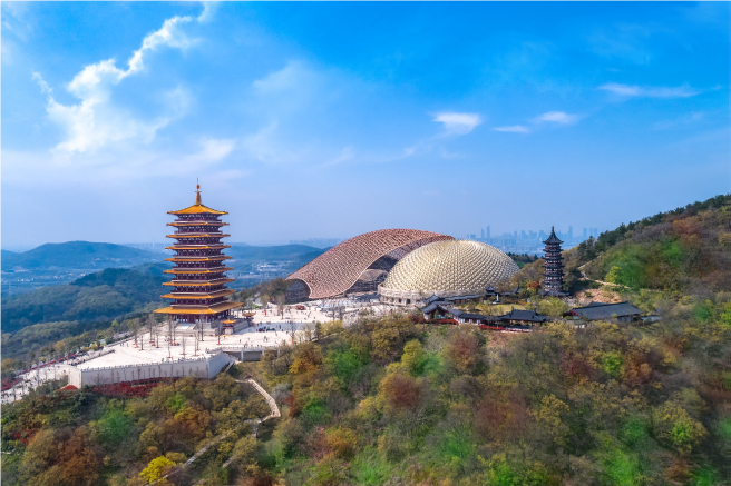 南京牛首山佛頂宮位于南京市江寧區牛首山遺址公園,一期項目包括“一路、一宮、一塔、一葉”四個區域。其中最吸引眼球的便是位于布局中心的巨大穹頂——佛頂宮整個佛頂宮總建筑面積近10 萬平方米,主體建筑共9 層,地下利用礦坑建設了6 層,規模宏大,而這里就是安放和供奉釋迦牟尼頂骨舍利的地方。佛頂宮下部為蓮花寶座造型,主體結構采用鋼筋混凝土框架,上部為摩尼寶珠造型,采用鋁合金單層網殼結構+一體化幕墻圍護系統,形狀為橢球體,長軸方向為147m,短軸方向為97.4m, 高度為36.3m,幕墻總覆蓋面積11245m2,展開面積16305m2。上下結合形成“蓮花托珍寶”的神圣寓意。