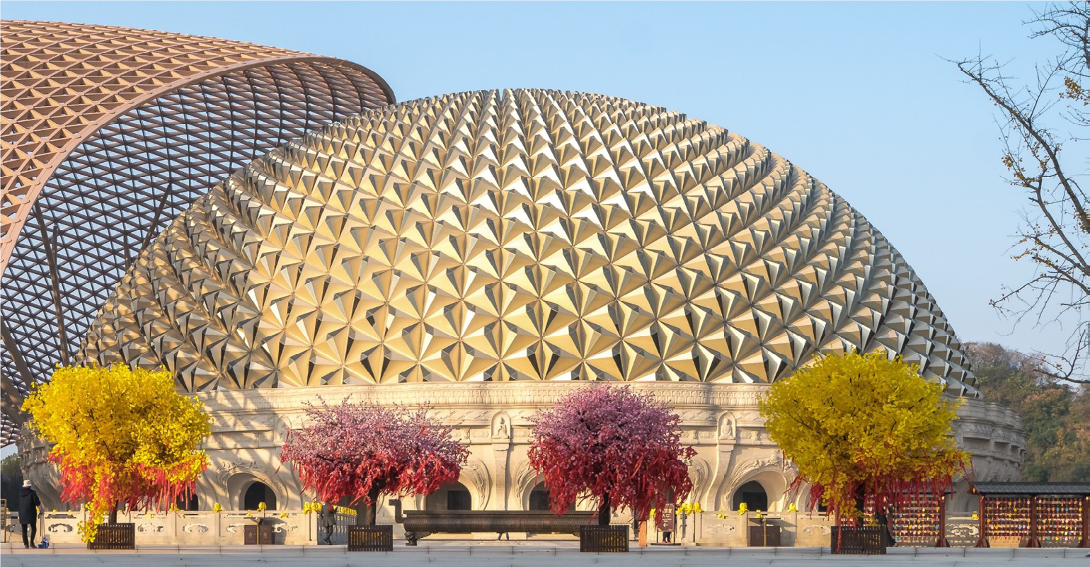一體化裝飾鋁板:5400 個尺寸各異的鋁板與玻璃組成的異形七面體構成了佛頂宮裝飾鋁板外表皮,每個單元以虔誠合十的佛手為寓意。橢圓形的外觀與璀璨的光澤如同寶珠,就像一顆光彩奪目的珍珠,高度契合設計意象。根據異形七面體的形狀規則建模出來每個七面體尺寸各不相同,單元底部體型為三角形,與鋁合金屋蓋三角形網格劃分保持一致, 巧妙實現了裝飾鋁板與主結構一體化。其一體化體系保持了建筑與結構的一致性,保證了建筑造型的精致表達。鋁合金結構一體化系統集成了主體結構、外裝飾造型幕墻、防水、保溫、吸音降噪、通風、采光、吊掛、維修清洗等全部功能。